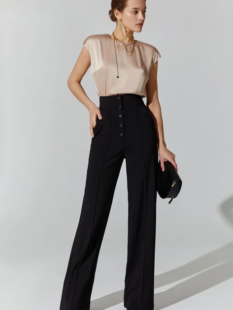 Wysoki stan i zapięcie na zatrzaski z przodu podkreślają talię.