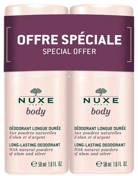 Nuxe Body Long-lasting Deodorant to wyjątkowe połączenie neutralizującego zapachy w 100% naturalnego srebra w proszku i w 100% regulującego pocenie się ałunu.