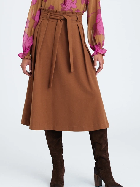 Ta spódnica emanuje elegancją dzięki rozkloszowanemu krojowi, który delikatnie dopasowuje się do sylwetki, tworząc delikatną równowagę pomiędzy wygodą a szykiem. Jej ciemnobrązowy kolor dodaje klasy i nadaje się zarówno do noszenia na co dzień, jak i na bardziej wyrafinowane okazje.