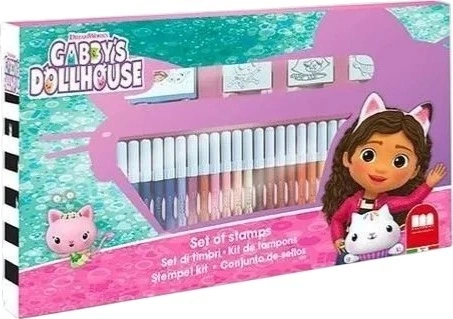 Zestaw flamastrów i stempli Dante Koci Domek Gabi zachwyci każdego małego artystę. Zestaw składa się z trzech drewniano-gumowych pieczątek ze wzorami postaci z bajki Koci Domek Gabi. Ponadto w opakowaniu znajdziemy również notatnik, w którym dziecko może stemplować i rysować za pomocą trzydziestu sześciu kolorowych, zmywalnych pisaków dołączonych do zestawu.