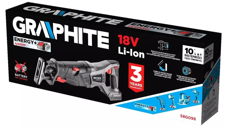 Kompaktowa i wygodna w użytkowaniu pilarka szablowa bezszczotkowa, należąca do oferty elektronarzędzi marki GRAPHITE, funkcjonująca w oparciu o nowoczesny system akumulatorowy Energy+. Pilarka jest kompatybilna z baterią litowo-jonową o mocy 18 V. Oferowana w zestawie z praktycznym brzeszczotem do drewna, zapewnia liczbę cykli do 3100 obrotów na minutę. Skok brzeszczotu wynosi 28 mm, a cięcie (w zależności od zamontowanego ostrza) to 120 mm dla drewna lub 10 mm dla stali.