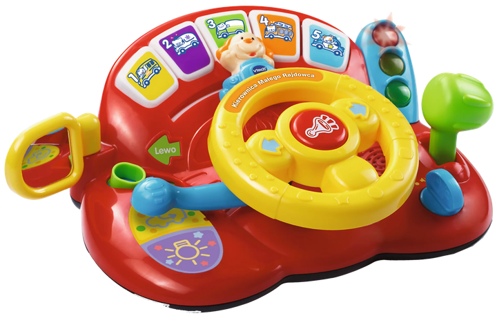 Kierownica Małego Rajdowca marki VTech, umożliwiająca odgrywanie ról, zapoznaje dziecko z nazwami pojazdów, zwierząt, kolorów i liczb. Dzięki ciekawym zwrotom i realistycznym dźwiękom samochodu przyciąga uwagę dziecka. Ponadto rozwija wyobraźnię dziecka poprzez obracanie kierownicy, przemieszczanie pojazdu i naciskanie klaksonu. Duże boczne lusterko, przycisk przyspieszenia i podświetlane światła drogowe zapewniają świetną zabawę.