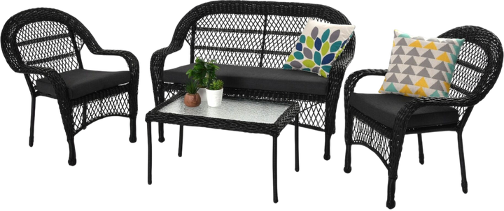 4-elementowy zestaw mebli wykonany jest z mieszanki rattanu płaskiego i okrągłego. Zestaw ten został wykonany w stylu boho co nadaje meblom wyjątkowo atrakcyjny charakter. Składa się z 2 foteli, stolika kawowego z blatem ze szkła hartowanego oraz wygodnej sofy w kolorze czarnym. Fotele i sofa wyposażone są w 5 cm poduszki w kolorze grafitowym. Meble są wytrzymałe, odporne na wilgoć, wodę oraz promieniowanie UV. Zapewniają stabilność oraz komfort siedzenia i odpoczynku. Poza tym cechuje je atrakcyjny wygląd oraz łatwość w czyszczeniu. Wystarczy opłukać je wodą z węża ogrodowego lub użyć do czyszczenia zwilżonej szmatki. Poduszki posiadają suwak, dzięki czemu można wyprać poszewki. Idealnie nadają się na tarasy, ogrody zimowe oraz do ogrodu.