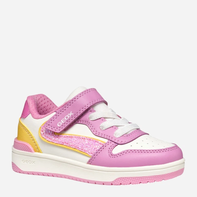 Sneakersy dla dziewczynki na rzepy Geox to stylowe i wygodne obuwie do codziennego użytku. Cholewka modelu wykonana jest z połączenia poliuretanu i tekstyliów, co zapewnia lekkość, trwałość i dobrą wentylację. Elastyczna podeszwa z gumy termoplastycznej gwarantuje doskonałą przyczepność do podłoża i długą żywotność. Miękka i sprężysta amortyzacja zwiększa komfort każdego kroku, redukując obciążenie stawów i poprawiając ogólną wydajność. Dzięki nowoczesnemu designowi te sneakersy doskonale uzupełnią codzienną garderobę dziecka, zapewniając stylowy wygląd i maksymalną wygodę.