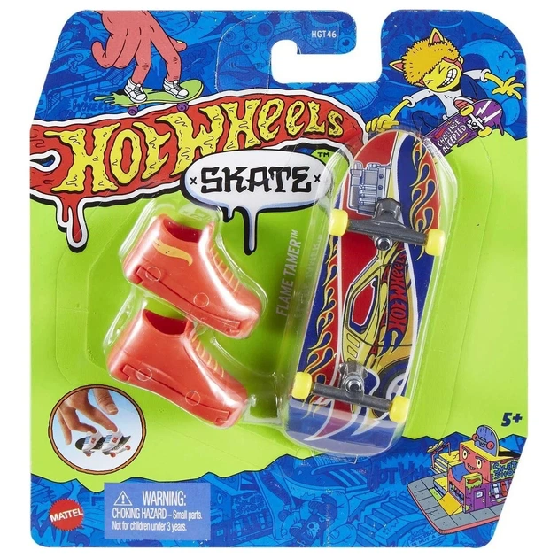 Hot Wheels i legenda skateboardingu, Tony Hawk, połączyli siły, aby stworzyć epicką kolekcję deskorolek do jazdy palcami doskonałą do ćwiczenia nowych sztuczek i niesamowitych tricków. W każdym zestawie jest deskorolka Hot Wheels do jazdy palcami oraz para stylowych zdejmowanych butów deskorolkowych, pomagających utrzymać palce na miejscu podczas rozgrzewających do czerwoności popisów. Nowicjusze mogą nabrać pewności siebie oraz lepiej wyczuć deskę i ruchy, a potem spróbować trudniejszych manewrów już bez butów na palce. Każda deska ma niepowtarzalny wzór, dzięki czemu fani będą chcieli zebrać je wszystkie. Sprzedawane oddzielnie w zależności od dostępności. Kolory i elementy dekoracyjne mogą się różnić.