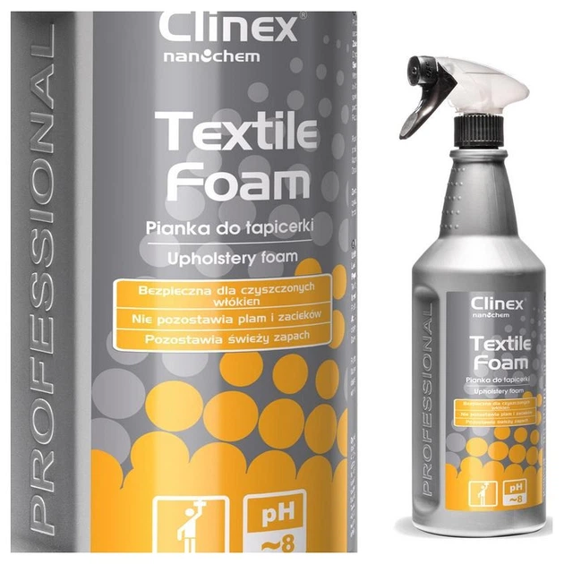 Текстильна піна CLINEX 1 л:Піна для ручного видалення бруду з оббивки. Продукт не містить відбілювачів або освітлювачів, тому препарат безпечний для очищених волокон. Захищає поверхню від забруднення, уповільнюючи його відкладення та проникнення у структуру волокон. Чудово освіжає колір. Залишає приємний, свіжий аромат.