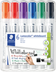 Zestaw markerów Staedtler Lumocolor do białych tablic 6 szt to marker do tablic suchościeralnych zawierający szybkoschnący tusz o słabym zapachu, który można usunąć na sucho z tablic i podobnych gładkich powierzchni bez pozostawiania śladów. Dzięki końcówce z blokadą, która zapobiega spadaniu z powrotem do korpusu, markery te zapewniają stałą szerokość linii 2 mm, odpowiednią do pisania odręcznego. Kolory: czarny, niebieski, zielony, pomarańczowy, fioletowy, czerwony.