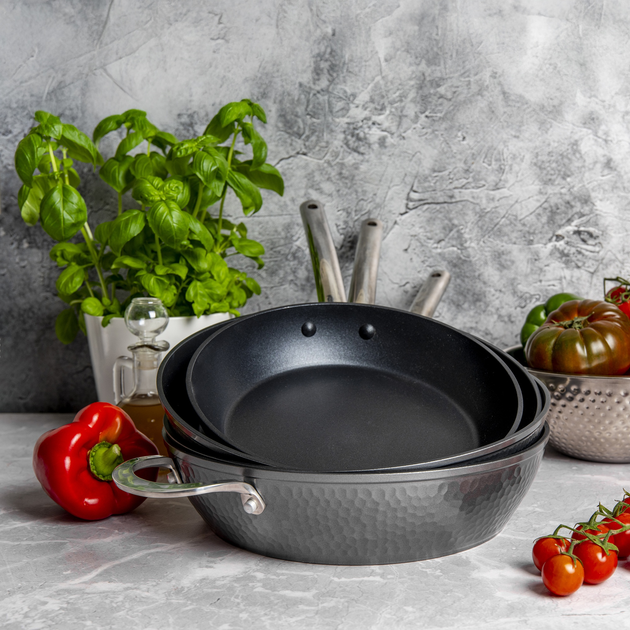 Elegancka patelnia Ambition z kolekcji Bubble została wykonana z odkuwanego aluminium o młotkowanym wykończeniu, które zachwyca trwałością i efektywnością. Równomierne nagrzewanie i doskonała akumulacja ciepła sprawiają, że gotowanie staje się szybsze i bardziej ekonomiczne. Powłoka nieprzywierająca Qualum Basic ułatwia smażenie bez tłuszczu i minimalizuje ryzyko przypalania potraw, a solidny stalowy uchwyt pozwala na używanie patelni także w piekarniku.