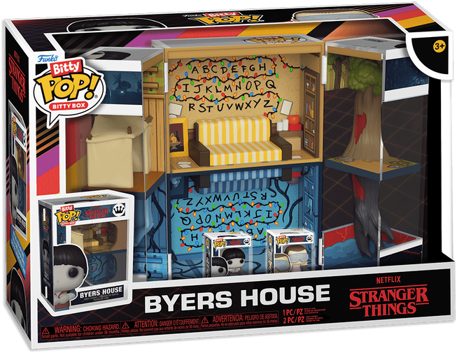 Zestaw zawiera akrylowe pudełko Bitty Box, stylizowane na klasyczne opakowanie Funko Pop!, które po otwarciu odsłania kultowe wnętrza domu Byersów. W środku znajdują się 2 figurki – Bitty Pop! Upside Down Will oraz Bitty Pop! Eleven w goglach – wiernie oddające bohaterów znanych z pierwszych sezonów serialu.