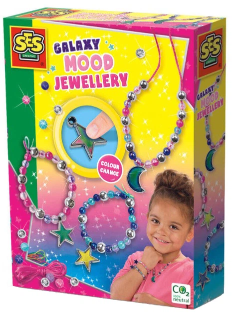 Dzięki biżuterii galaxy mood dzieci mogą stworzyć wyjątkową biżuterię.Charmsy pokazują Twój nastrój!Dzieci mogą nie tylko tworzyć piękne bransoletki i naszyjniki, ale także zachwycać się zmieniającymi się kolorami zawieszek!Zestaw zawiera wrażliwe na temperaturę zawieszki w kształcie gwiazdy, księżyc, koraliki w kolorze perłowym i posrebrzanym, sznurek i gumkę do tworzenia różnych elementów biżuterii.