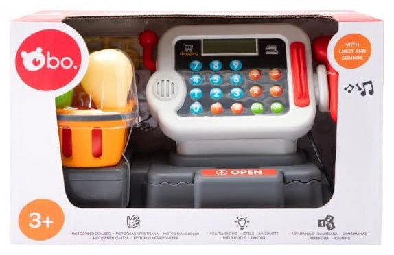 Kasa sklepowa bo. – świetny zestaw do zabaw w odgrywanie ról. W zestawie znajduje się kasa, zabawkowe pieniądze, karta kredytowa, produkty oraz koszyk na zakupy. Posiada efekty świetlne i dźwiękowe, działa na baterie (2×AA, w zestawie). Zalecany dla dzieci powyżej 3 lat.