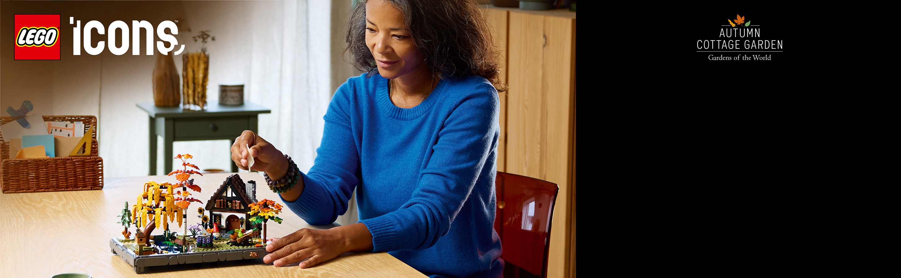 Stwórz efektowną dekorację do domu lub biura dzięki zestawowi LEGO Icons Jesienny ogród z chatką dla dorosłych.