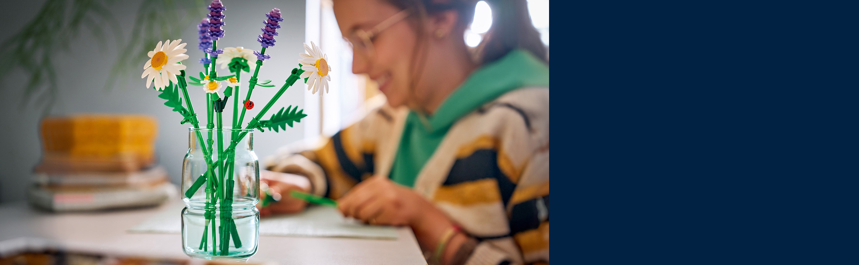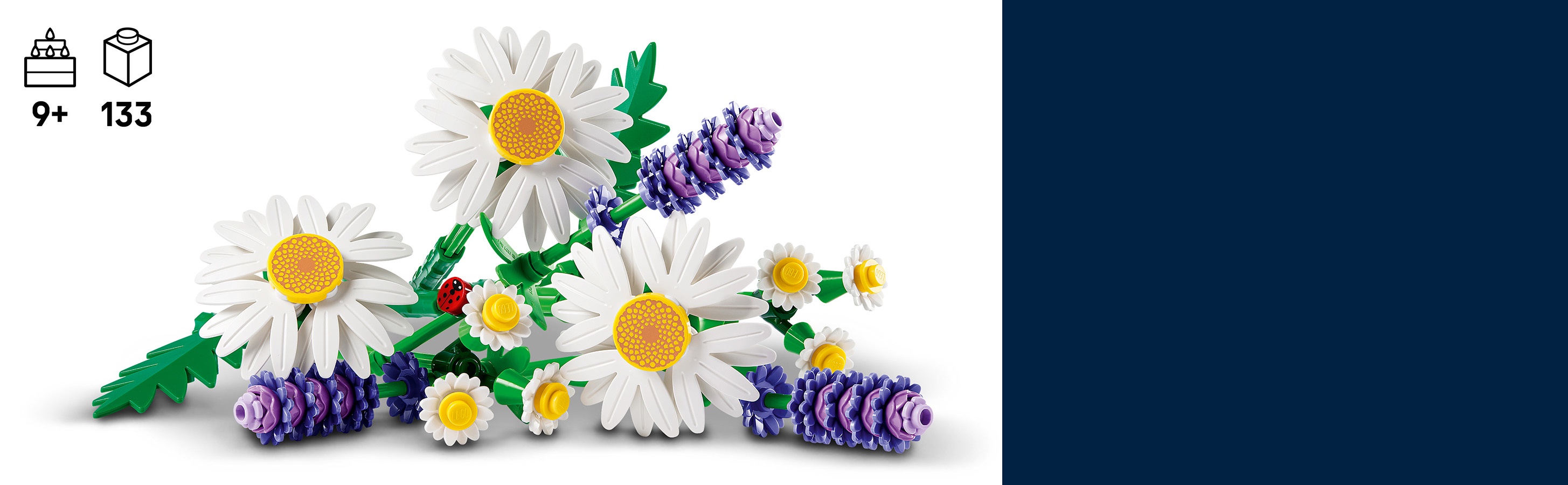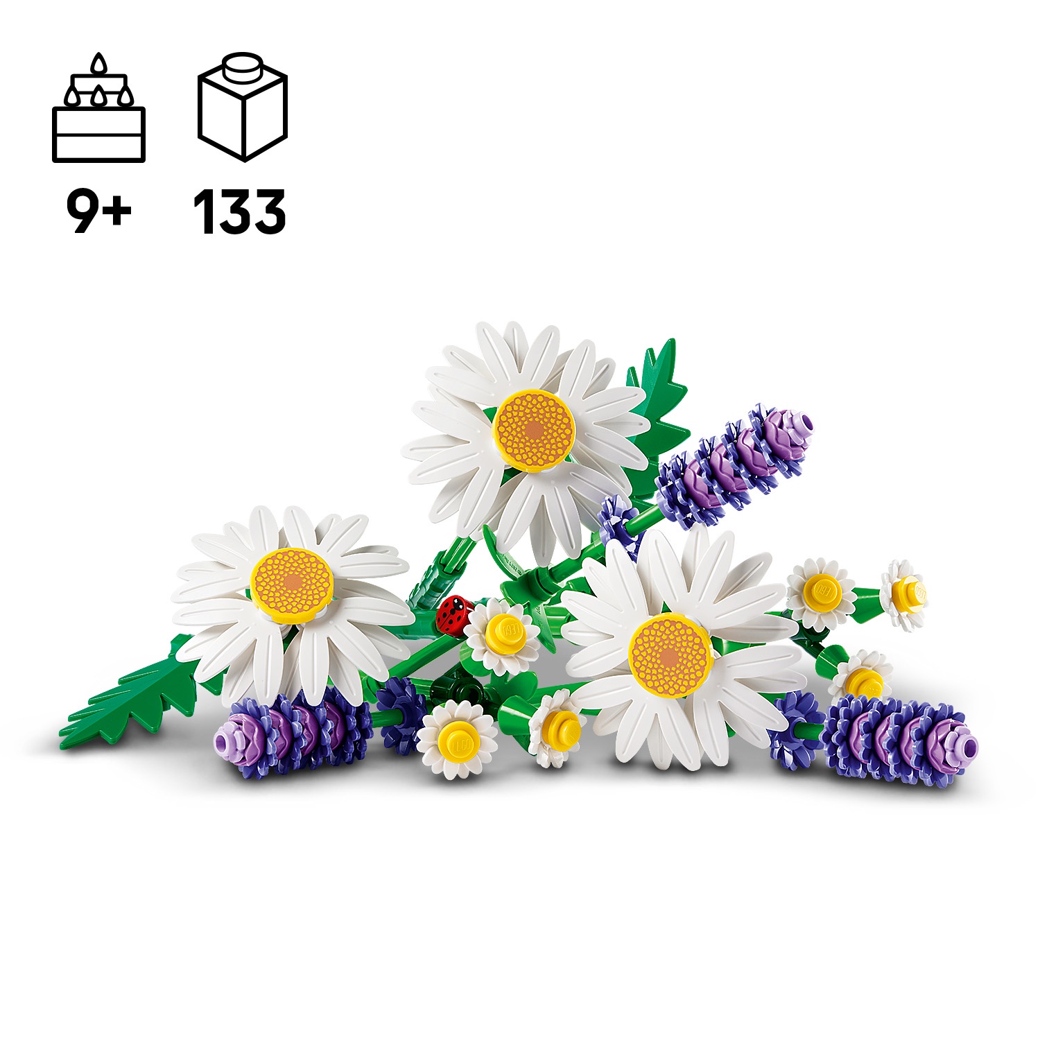 Діти отримають величезне задоволення, створюючи чарівний букет квітів LEGO, який містить три маргаритки, дві гілочки маленьких маргариток, три гілочки лаванди та яскраво-зелені стебла. Маленький букет LEGO, який поєднує радість і спокій, містить дуже реалістичні квіти та сонечко на одній із гілочок лаванди — це чарівний аксесуар, який неодмінно сподобається юним конструкторам. Після складання діти можуть похвалитися своїм букетом штучних квітів як естетичною прикрасою для спальні, яка ніколи не зів'яне і не потребуватиме поливу.