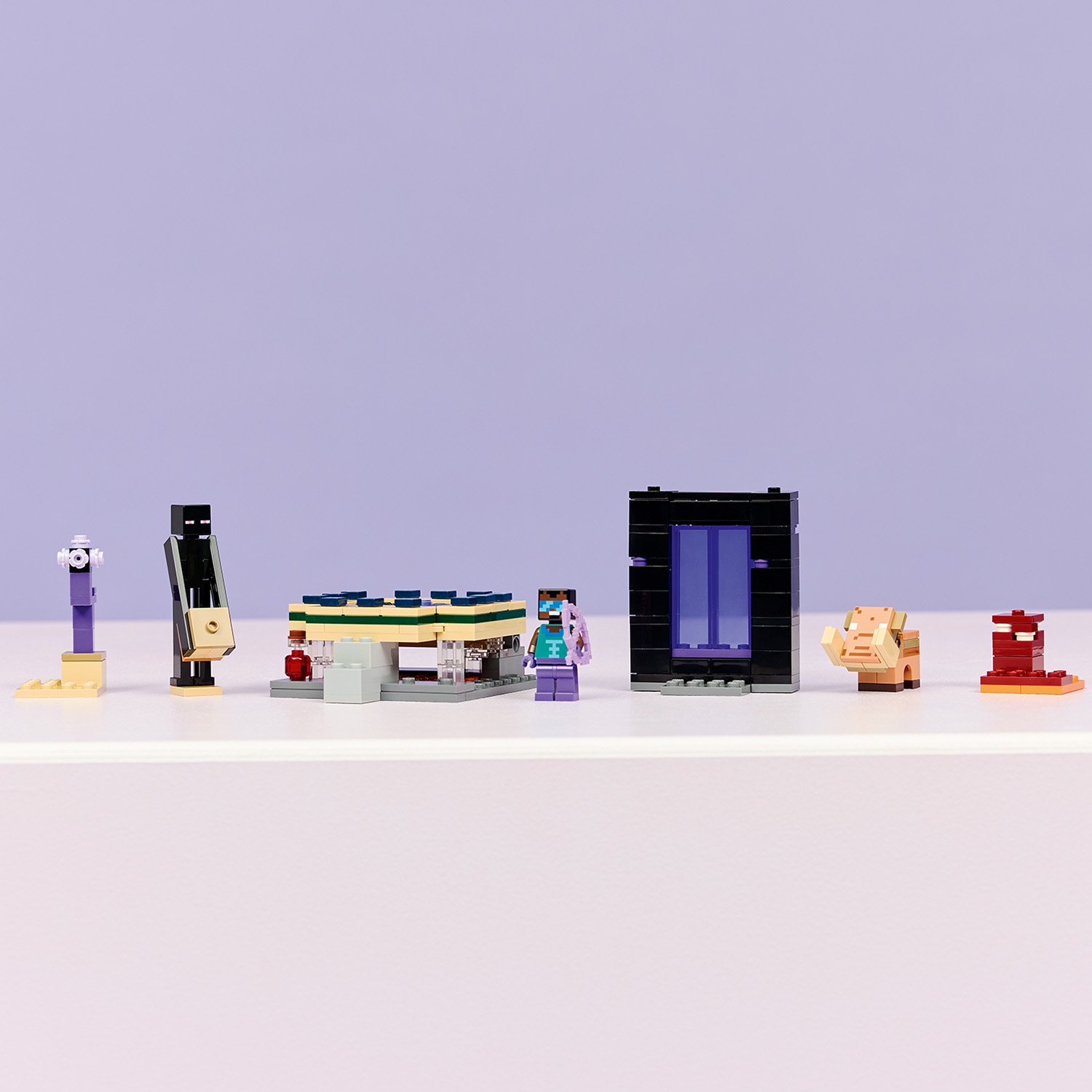 Zestaw klocków dla dzieci LEGO Minecraft zawiera portal Kresu i Netheru z funkcjami umożliwiającymi dostęp do małych modeli w obu biomach. Na dzieci czekają autentyczne akcesoria z gry, w tym zaczarowany łuk i eliksir leczniczy, które inspirują do niekończących się kreatywnych przygód z udziałem znanych motywów i postaci z gry Minecraft.