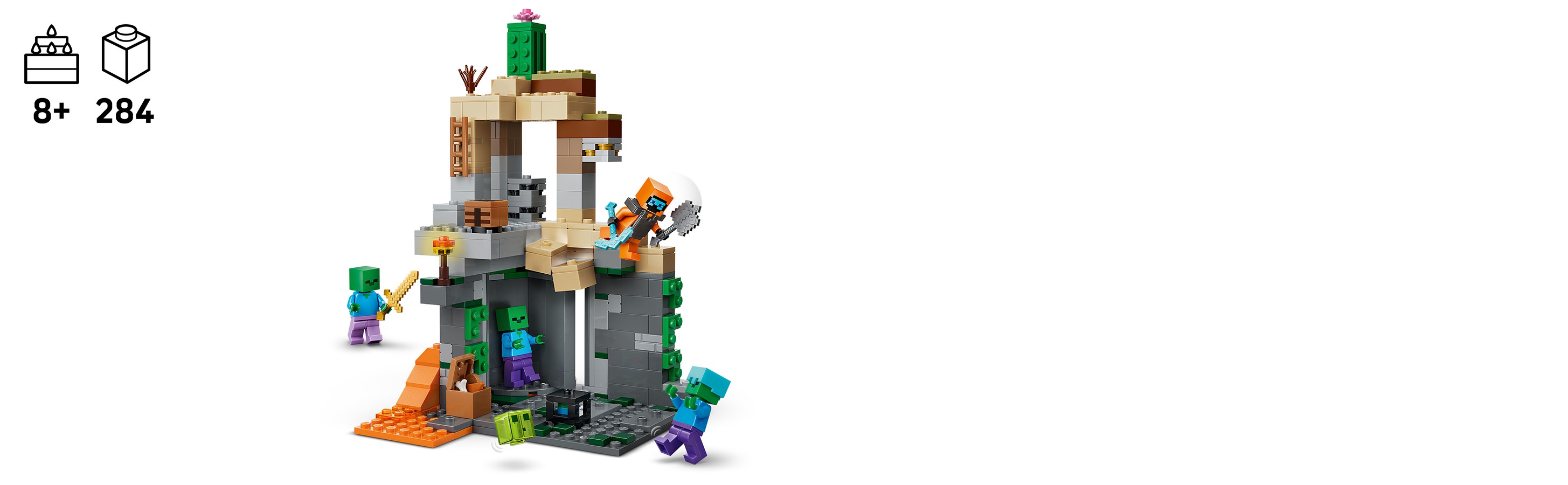 - Zabawka konstrukcyjna do odgrywania przygód — akcja rozgrywa się w pustynnym biomie Minecrafta, a interaktywne elementy takie jak komora wypuszczająca zombie, czy przesuwany element wyzwalający lawinę kamieni, inspirują do kreatywnej zabawy
