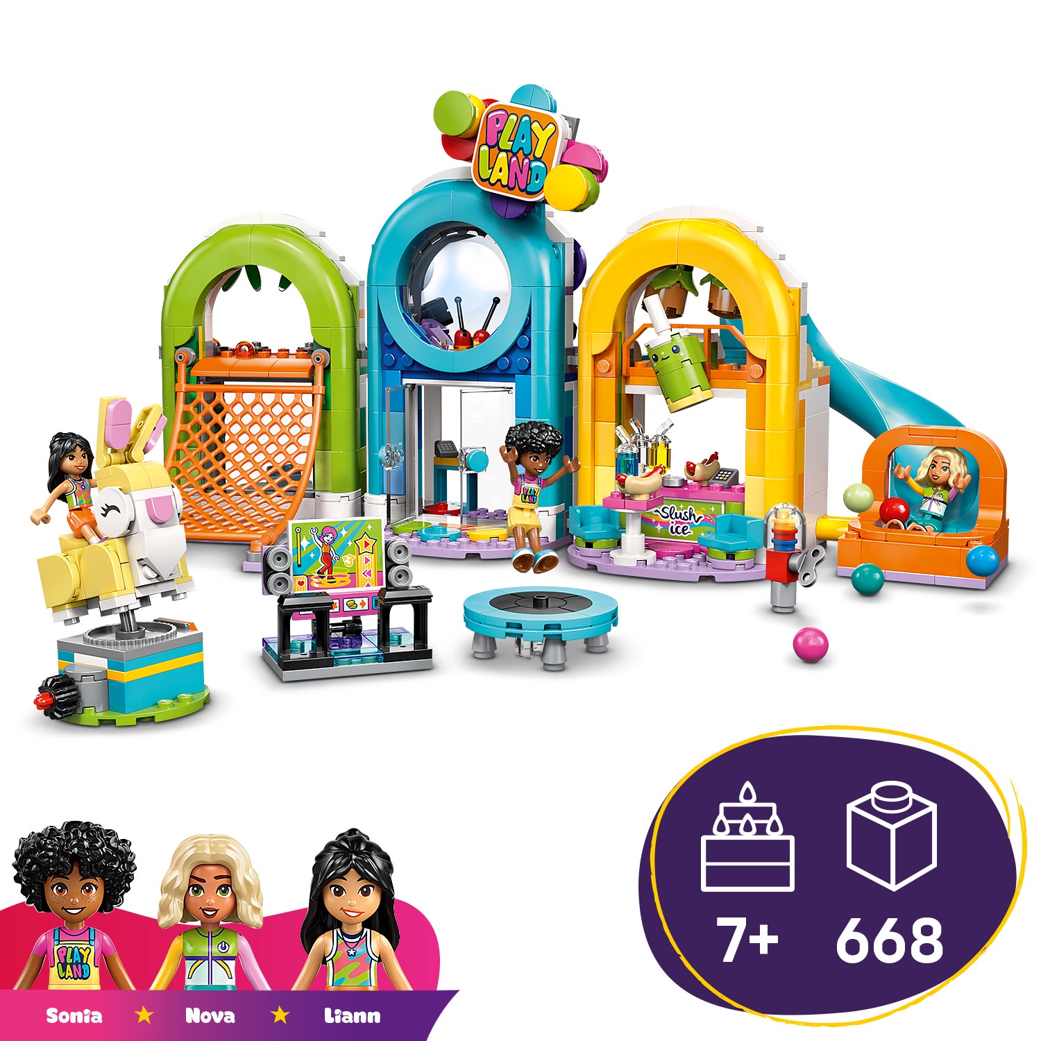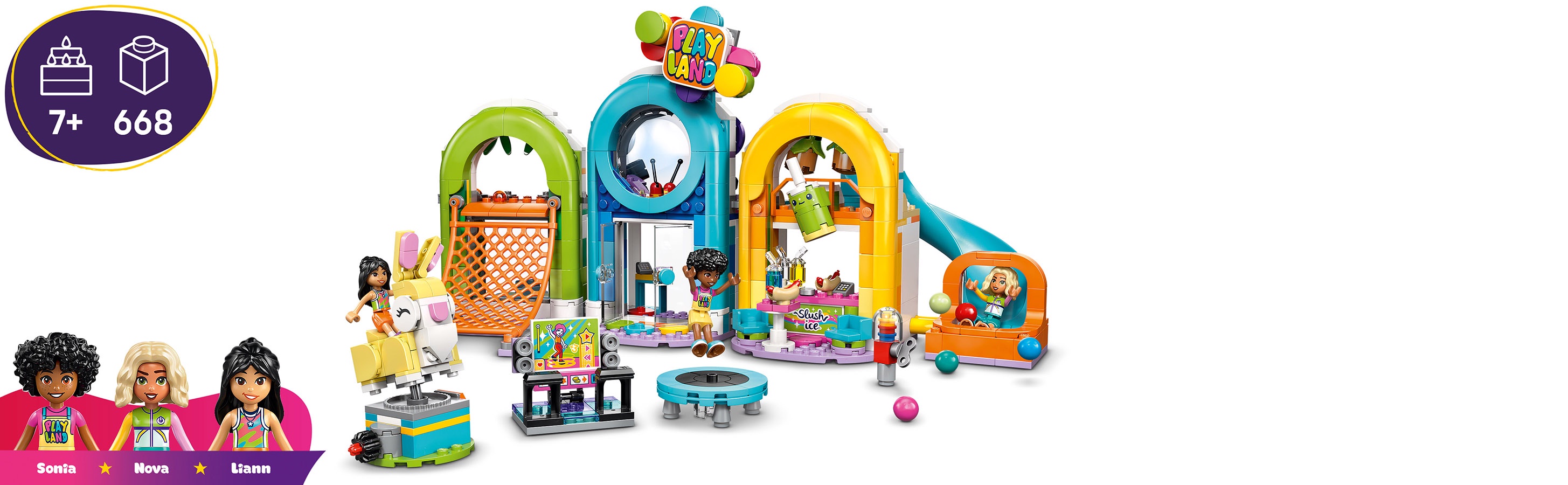 Twórz zabawne historie na krytym placu zabaw z siatką do wspinania się, karuzelą, basenem z piłeczkami, zjeżdżalnią, zabawką w kształcie króliczka i nie tylko.
