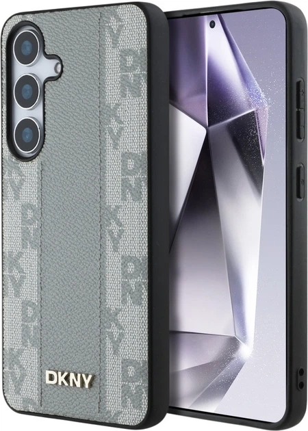 Każde etui zostało ozdobione unikalnym wzorem inicjałów marki DKNY, które układają się w efektowny geometryczny motyw kratki. Ten charakterystyczny wzór przyciąga uwagę swoją niepowtarzalnością i wyjątkowym designem. Dodatkową ozdobą jest szeroki, pionowo ułożony pas utrzymany w kolorystyce pokrowca, co tworzy spójną i elegancką całość. Projekt zwieńcza niewielkie logo marki DKNY, które podkreśla prestiż i autentyczność tej kolekcji.