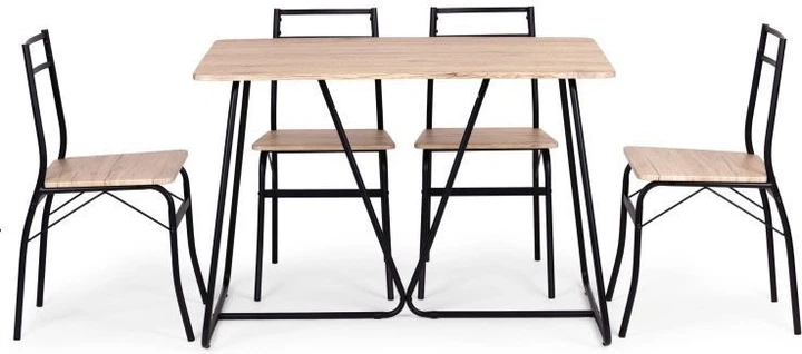- Стільниця столу та елементи стільців виготовлені з плити MDF, покритої плівкою, що забезпечує легкість очищення та стійкість до щоденного використання. Це рішення гарантує естетику й довговічність в одному.