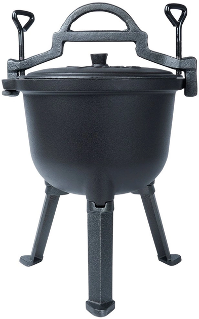 PRAKTYCZNY - Kociołek żeliwny na nóżkach z pokrywą oraz uchwytem, wnętrze emaliowane. Kociołek o średnicy 25.5 cm i pojemności 8 l. Wymiary zewnętrzne kociołka z pokrywką i nóżkami: 33 x 29 x 47 cm, wysokość kociołka bez pokrywy wynosi 35 cm. Idealne sprawdzi się do przygotowywania dań w ogrodzie, na kempingu, przy grillu czy też ognisku.