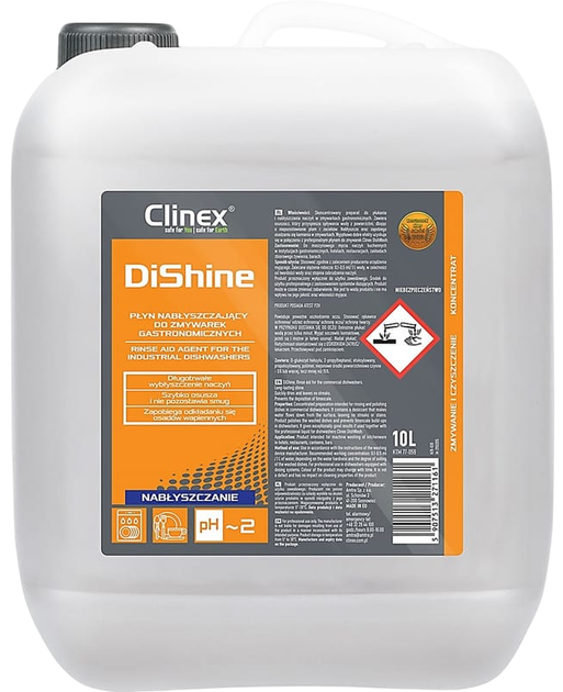Skoncentrowany preparat do płukania i nabłyszczania naczyń w zmywarkach gastronomicznych. Nabłyszczacz Clinex Dishine zawiera osuszacz, który przyspiesza spływanie wody z powierzchni, dbając o niepozostawianie plam i zacieków. Nabłyszcza oraz zapobiega osadzaniu się kamienia w zmywarkach.
