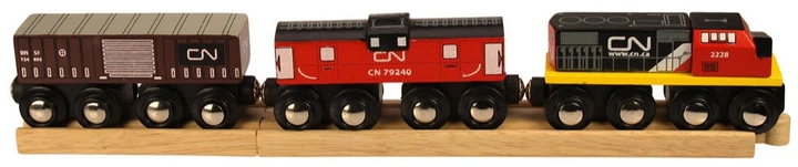 Model inspirowany jest prawdziwą kanadyjską firmą kolejową CN, obsługującą trasy transkontynentalne. W komplecie znajduje się lokomotywa, wagon serwisowy oraz wagon towarowy — wszystkie elementy wykonane są z dbałością o detale i z bezpiecznych materiałów.