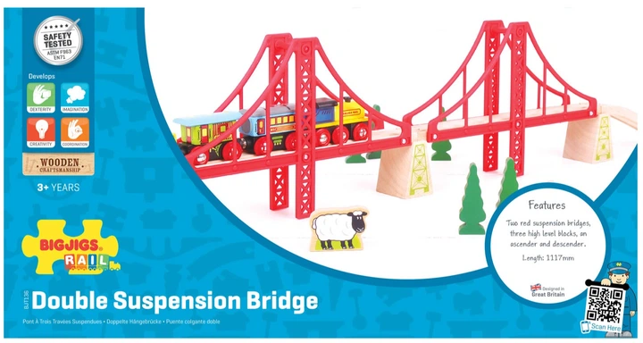 Duży most wiszący Bigjigs Rail dodaje drewnianej kolei imponującego rozmachu i staje się efektownym elementem każdej trasy. Dzięki długości przekraczającej 1 metr umożliwia budowę bardziej złożonych układów i dynamicznych scenariuszy zabawy. Jest jednym z największych mostów w linii akcesoriów Bigjigs Rail, co czyni go wyjątkowo atrakcyjnym dodatkiem do każdej kolekcji.