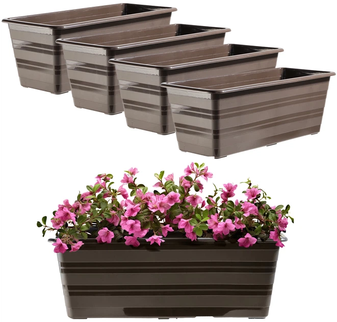 Zestaw donic balkonowych Kadax Catí o średnicy 40 cm w kolorze brązowym (4 szt.) to praktyczne i stylowe rozwiązanie do aranżacji balkonu lub tarasu, łączące funkcjonalność, niezawodność i stabilność. Donice wykonane są z wytrzymałego tworzywa sztucznego, odpornego na wilgoć, promieniowanie ultrafioletowe, chemikalia i skrajne temperatury, co gwarantuje długą żywotność i trwałość koloru. Prostokątny kształt i długość 39.5 cm zapewniają wystarczająco dużo miejsca dla kwiatów i roślin ozdobnych, a wodoodporność pozwala na ich użytkowanie na zewnątrz bez ryzyka uszkodzenia. Dzięki odporności na warunki atmosferyczne donice idealnie nadają się do użytku na zewnątrz przez cały rok, a 2-letnia gwarancja potwierdza ich jakość i trwałość.