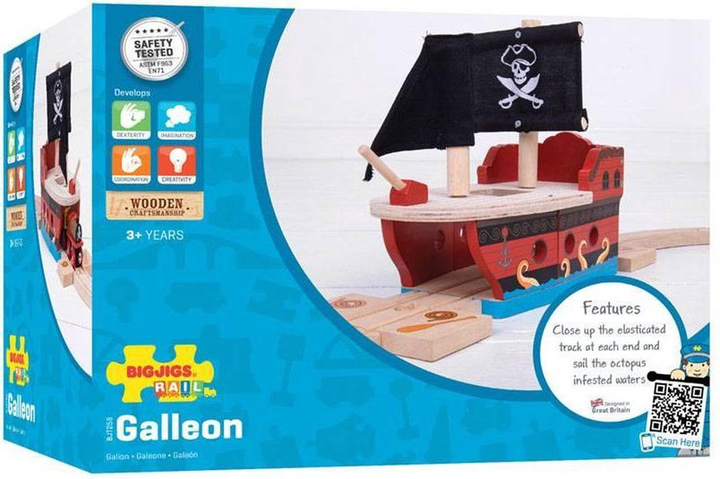 Wyrusz na poszukiwanie skrzyni ze skarbami na tej drewnianej pirackiej galerze od Bigjigs! Podnieś żagle, ułóż pod galera dwa tory i pozwól swojemu pociągowi ruszyć w podróż z lądu na morze. Morze pełne jest przygód i ośmiornic — unikaj ich i baw się jak prawdziwy pirat.