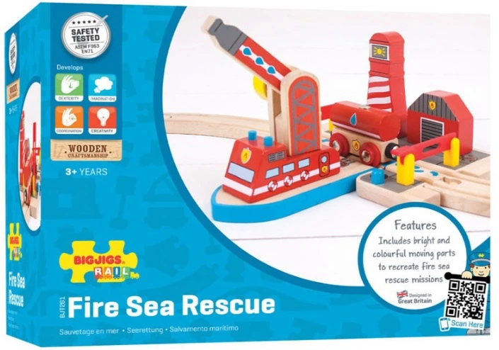 Wyrusz na misję ratunkową koleją i morzem z tym drewnianym zestawem Bigjigs Rail! Strażacka łódź to ekscytujący dodatek do każdej drewnianej kolei. Wyposażona w ruchomy wąż strażacki oraz strefę do transportu wagonu ze zdejmowanym zbiornikiem na wodę, który można załadować na łódź.