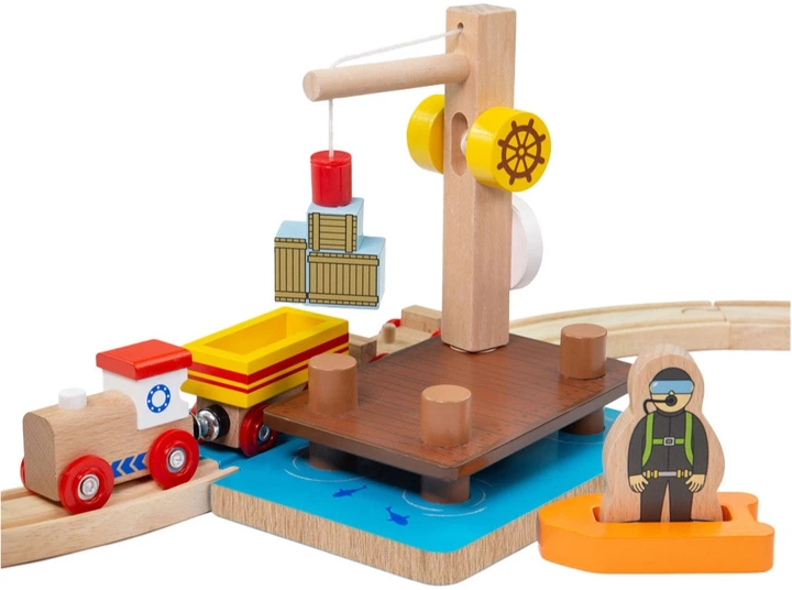 Zestaw zawiera nabrzeże z żurawiem, łódkę oraz figurkę nurka, który zawsze jest gotowy, aby uratować ładunek, który wpadł do wody. Solidne drewno, nietoksyczne farby i trwała konstrukcja gwarantują bezpieczną i długotrwałą zabawę.