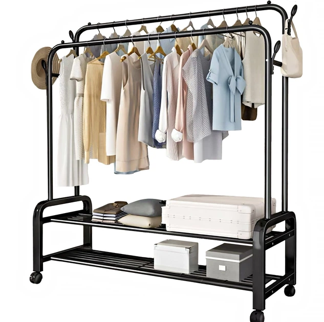 Потрібно більше місця для вашого одягу? Ця подвійна вішалка - чудове рішення. Оснащена універсальними колесами, вона дозволяє легко переміщувати вішалку по вашому дому. Він простий у використанні та вміщує багато одягу, зберігаючи його організованим.