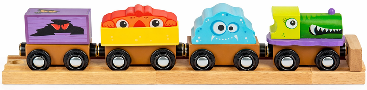 Ten tematyczny zestaw został stworzony z myślą o małych miłośnikach przygód. W komplecie znajduje się lokomotywa z zabawną „potworną” buźką, trzy wagony ze zdejmowanym ładunkiem, dwie drewniane tory oraz przystanek. Dzieci mogą tworzyć własne historie, organizować misje ratunkowe, przewozić ładunki i budować całe światy wokół swojego potwornego pociągu.