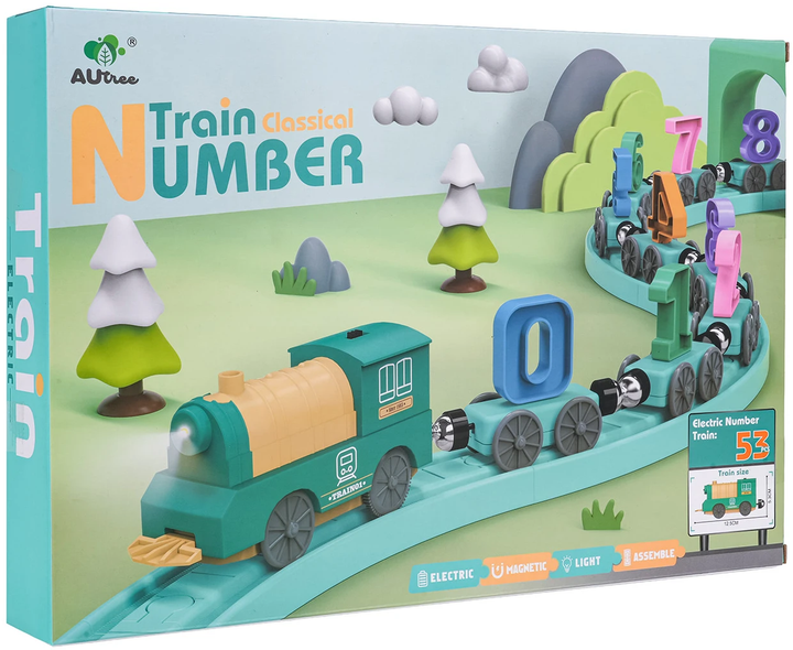 Zestaw składa się z 53 elementów, w tym torów, lokomotywy i 15 wagoników magnetycznych z nadrukowanymi cyframi i znakami matematycznymi. Wagoniki łatwo się ze sobą łączą, a ich kolejność można dowolnie zmieniać, dopasowując do poziomu i potrzeb dziecka.