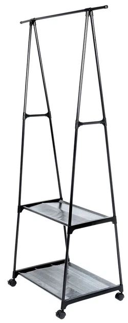 Wieszak podłogowy – wieszak na ubrania z dwiema półkami. Wieszak ma wymiary zewnętrzne: 88 x 44 x 160 cm.