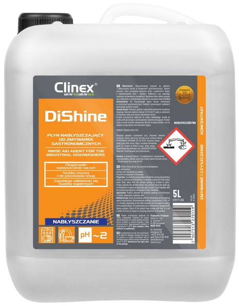 Clinex DiShine to skoncentrowany nabłyszczacz przeznaczony do profesjonalnych zmywarek gastronomicznych. Zawiera składnik przyspieszający suszenie, który usprawnia spływanie wody z powierzchni naczyń, zapobiegając powstawaniu plam, smug i zacieków. Dla uzyskania najlepszych efektów zaleca się stosowanie preparatu w połączeniu z profesjonalnym płynem do mycia naczyń Clinex DishWash. Razem zapewniają idealnie czyste i lśniące naczynia w krótkim czasie.