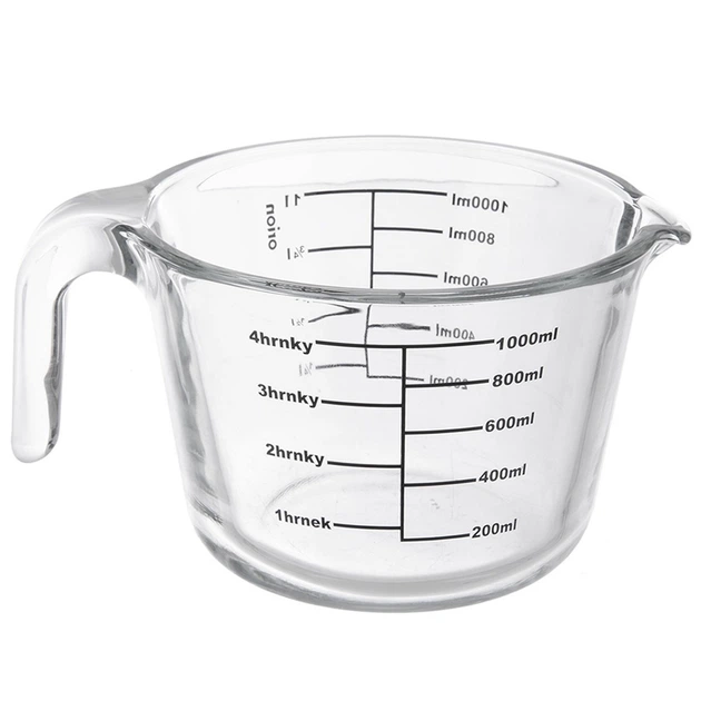 Precyzyjny i czytelny pomiar – Naczynie posiada widoczną czarną skalę, która pozwala na odmierzanie płynów w mililitrach od 200 do 1000 ml (z podziałką co 200 ml), w litrach od 1/4 l do 1 l oraz w kubkach od 1 do 4.