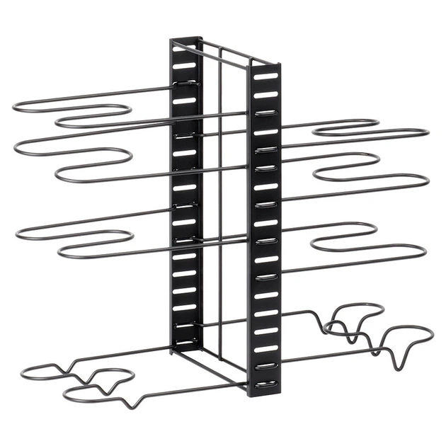Dwa sposoby użytkowania – Wieszak może być używany w dwóch wersjach: jako samodzielny organizer na pokrywki, talerze i deski do krojenia lub jako wieszak na garnki, patelnie i pokrywki. To rozwiązanie 2 w 1 pozwala dopasować układ przechowywania do potrzeb i dostępnej przestrzeni kuchennej.