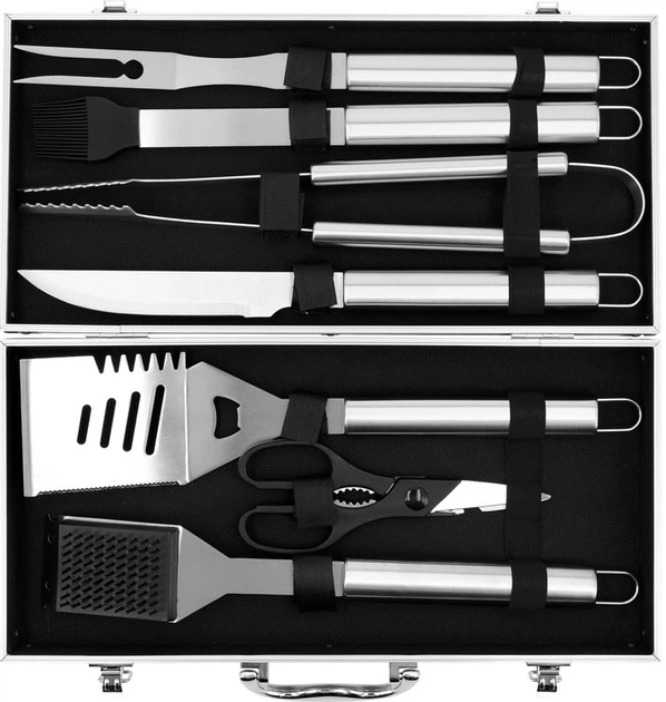 - zawiera: widelec, szczypce, łopatkę, nóż, nożyczki, pędzelek i szczotkę