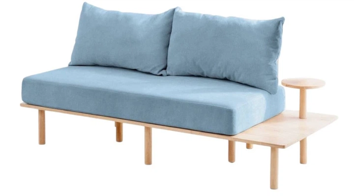 Sofa SERI to wyjątkowy mebel, który łączy minimalistyczny design z funkcjonalnością. Subtelna niebieska tapicerka dodaje wnętrzu lekkości i nowoczesności, a naturalne drewniane elementy ocieplają aranżację, wprowadzając przytulny nastrój.
