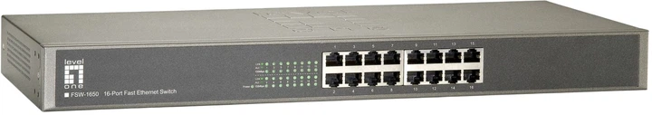 LevelOne FSW-1650 to bezblokadowy, 16-portowy, niezarządzalny przełącznik Fast Ethernet działający z pełną prędkością (wire-speed), wyposażony we wbudowany zasilacz. Zapewnia on sieć z tablicą adresów MAC o pojemności 8K, przepustowością magistrali przełączającej 3.2 Gbps, obsługą asymetrycznej kontroli przepływu dla połączeń pełnodupleksowych, automatyczną negocjacją oraz funkcją Auto-MDIX.