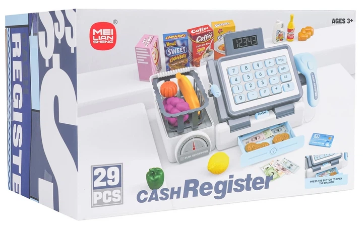 Interaktywna kasa fiskalna z akcesoriami dla dzieci od 3. roku życia. Wykonana z wysokiej jakości tworzywa sztucznego w żywych kolorach. Kasa posiada kalkulator, skaner, wagę (atrapę), otwieraną szufladkę na pieniądze oraz koszyczek z atrapami produktów spożywczych. Zasilana bateriami 3 x AA 1,5 V (brak w zestawie).