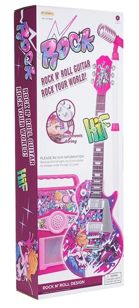 Elektryczna gitara ze wzmacniaczem oraz mikrofonem na regulowanym stojaku to atrakcyjna propozycja dla dzieci od 3. roku życia. Gitara wyposażona jest w regulację głośności, różnorodne rytmy, efekty dźwiękowe oraz osiem gotowych melodii. Zabawka zasilana jest bateriami 3 × AA 1,5 V (brak w zestawie).