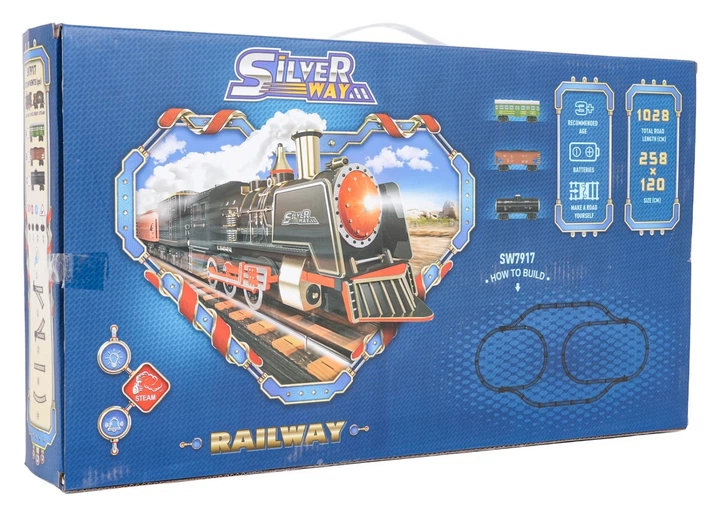 Zestaw retro kolejka z funkcją dymu, światła i dźwięku dla dzieci od trzeciego roku życia. Zabawka zasilana jest bateriami typu 4 x AA 1,5V (brak w zestawie). Podczas jazdy lokomotywa wypuszcza kominem dym, po wcześniejszym uzupełnieniu jej wodą (pipetka do wody dołączona do zestawu), świeci się przedni reflektor i słychać odgłosy jazdy. Tory są wytrzymałe i bezpieczne oraz posiadają łatwy sposób łączenia.
