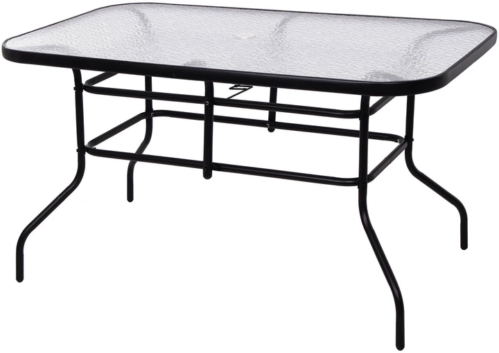Stół ogrodowy Springos GF0080 to praktyczny i stylowy mebel ogrodowy, idealny na rodzinne obiady i spotkania na świeżym powietrzu. Prostokątny blat o wymiarach 120×70 cm zapewnia komfortowe miejsce dla 6–8 osób, a solidna, malowana proszkowo metalowa konstrukcja gwarantuje stabilność i trwałość. Blat wykonany jest z przezroczystego, hartowanego szkła o grubości 4 mm, dzięki czemu jest bezpieczny, odporny na zarysowania i łatwy w czyszczeniu. Pośrodku blatu znajduje się otwór na parasol o średnicy 4 cm, zabezpieczony plastikową zaślepką. Nogi i rama wykonane są z owalnego profilu metalowego 42×15 mm, a pod blatem znajduje się dodatkowa, prostokątna konstrukcja ze stabilizatorem na drążek parasola. Odległość między nogami wynosi 110 i 62 cm, co zapewnia wygodne ustawienie. Całkowita wysokość stołu wynosi 70 cm, a wysokość krawędzi blatu 3 cm. Stół ten łączy w sobie funkcjonalność, trwałość i nowoczesny design, a zestaw elementów montażowych ułatwia i przyspiesza montaż.