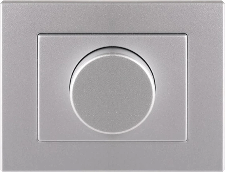 Metaliczne wykończenie nadaje ściemniaczowi nowoczesny, techniczny charakter, który dobrze komponuje się z elementami w kolorach stali, szarości czy betonu. Zintegrowana ramka ułatwia montaż i pozwala zachować spójny wygląd osprzętu elektrycznego na ścianie.