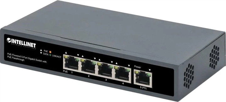 Intellinet IPS-05G-65W to kompaktowy przełącznik dla małych biur lub grup roboczych, który umożliwia nie tylko przesyłanie danych, ale także zapewnia zasilanie PoE dla podłączonych urządzeń. Urządzenie podłącza się do przełącznika PoE lub iniektora i może zasilać do czterech urządzeń, takich jak kamery IP, telefony VoIP lub punkty dostępowe Wi-Fi, jednocześnie otrzymując własne zasilanie ze źródła PoE.