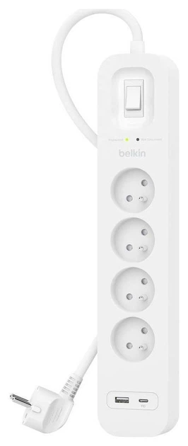 Listwa zasilająca Belkin 525J, 4 gniazda, USB-A, USB-C PD, 2mChroń swoje urządzenia elektroniczne dzięki 525 dżulom ochrony oraz portom USB-C i USB-A dla dodatkowej wygody. Zaprojektowany z myślą o bezpiecznej pracy - wskaźniki świetlne pokazują, czy urządzenia są chronione. To dodatkowa oszczędność czasu dzięki technologii USB-C PD, która ładuje współczesne urządzenia do 70% szybciej niż tradycyjna ładowarka 5 W.