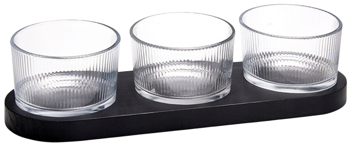 4-elementowy zestaw do serwowania przekąsek. Zawiera trzy szklane miseczki z tłoczonym wzorem w paski oraz czarną tacę z drewna sosnowego o wymiarach 30 x 10 cm. Zapakowany w pudełko prezentowe.