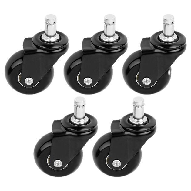 - Zestaw 5 szt. wymiennych kółek do fotela - Komplet pięciu zapasowych kółek do fotela biurowego. Średnica każdego kółka wynosi 5 cm. Średnica trzpienia mocującego wynosi 11 mm. Zapewnią ciche i płynne przesuwanie fotela.