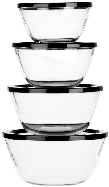 - Zestaw 4 szt. misek szklanych z pokrywkami - Komplet obejmuje cztery miski o różnych pojemnościach: 750 ml, 1 l, 1.5 l i 2 l. Idealne do przechowywania produktów spożywczych, przygotowywania sałatek oraz serwowania potraw. Dzięki przezroczystemu szkłu zawartość jest zawsze dobrze widoczna.